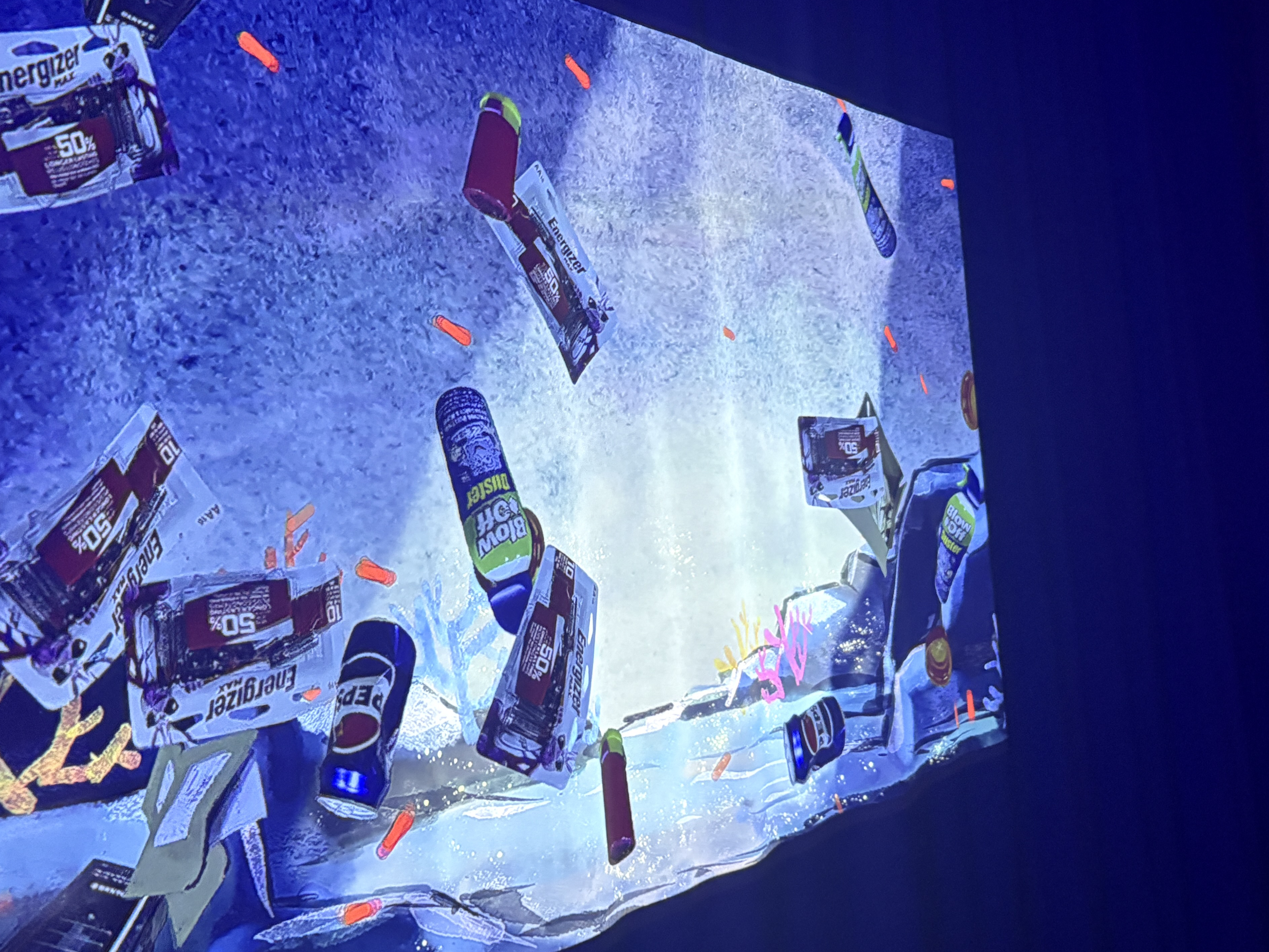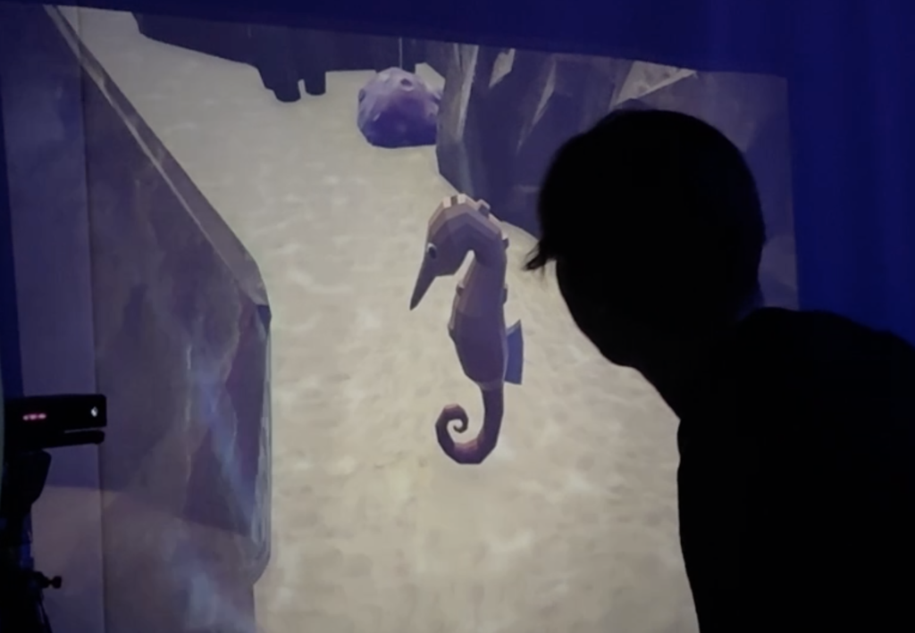 Ghosts of the Deep is a project made in response to a specific type of ocean pollution, ghost nets. Ghost nets are fishing nets that are abandoned or discarded by fishermen and left in the ocean ecosystem. Ghost nets choke out coral reefs, impact fish feeding grounds, and trap fish. The player’s goal is to navigate the environment to find shoals of krill to feed themselves as a seahorse constantly. If the player starves from hunger, the experience ends. Using an Xbox Kinect, the project tracks the player’s body movements to control the seahorse character in the game, allowing players to become physically immersed in the struggles of a seahorse.