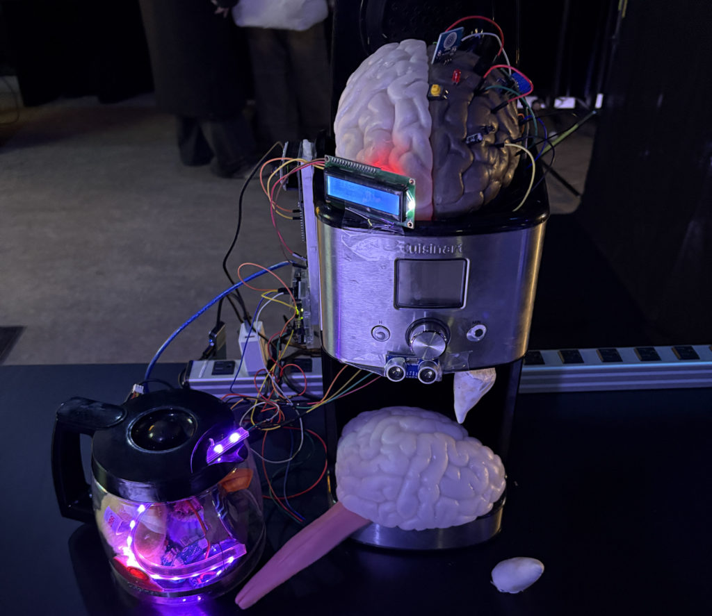 Brain Roast is a sculptural installation where a silicone brain rests on top of a modified coffee machine, treated as both raw ingredient and sacrificial offering. The machine becomes a small monster with teeth and a tongue, endlessly “processing” thoughts and emotions. On its display, system-like messages such as “Memory Roast” and “Overthinking Mode” flicker like a mental interface. In the pot below, what drips out is not coffee but a symbolic extract of memories, desires, and feelings.