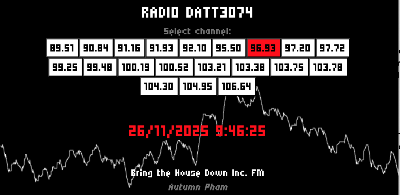 RADIO DATT3074 is a generative radio station with many channels to explore. On each channel, the sound is continuously generated on the fly, responding to the current date and time to ensure it is always evolving. It was authored using gen~ and RNBO in Max.