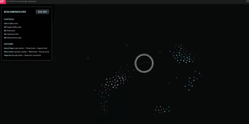 Bioluminescent is an interactive piece with hand motion gesture detection that mimics the natural bioluminescent phenomenon. The piece has a flocking particle simulation which changes colours and sounds depending on the hand motion and gestures. The flocking particle boids could be interacted with the hand gesture detection like creating new boids with a flick of the fingers or disturbing their grouping with quick hand movements.