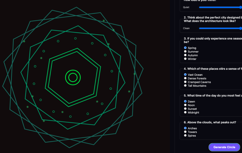 Circle of Creation is an interactive generative artwork that turns a short questionnaire into a personal Magic Circle. The design goal was to visualize a user’s inner state; Mental noise, preferred environments, and aesthetic choices through geometry, motion, sound. Ensuring each circle feels unique but still belonging to the same system.