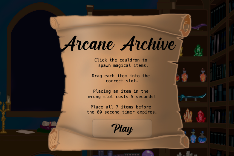 Arcane Archive is an interactive magical storting game that combines animation, particle systems, sound design and visual effects. You as a magical being are tasked by organizing mystical books, items and artifacts on shelves and the table before time runs out. Each item (books, potions, crystals, and a quill) are conjured from a bubbling cauldron and must be dragged into its correct slot. The game blends whimsical fantasy visuals, all drawn by me, dynamic physics and a time-pressure puzzle mechanic to create an immersive environment.