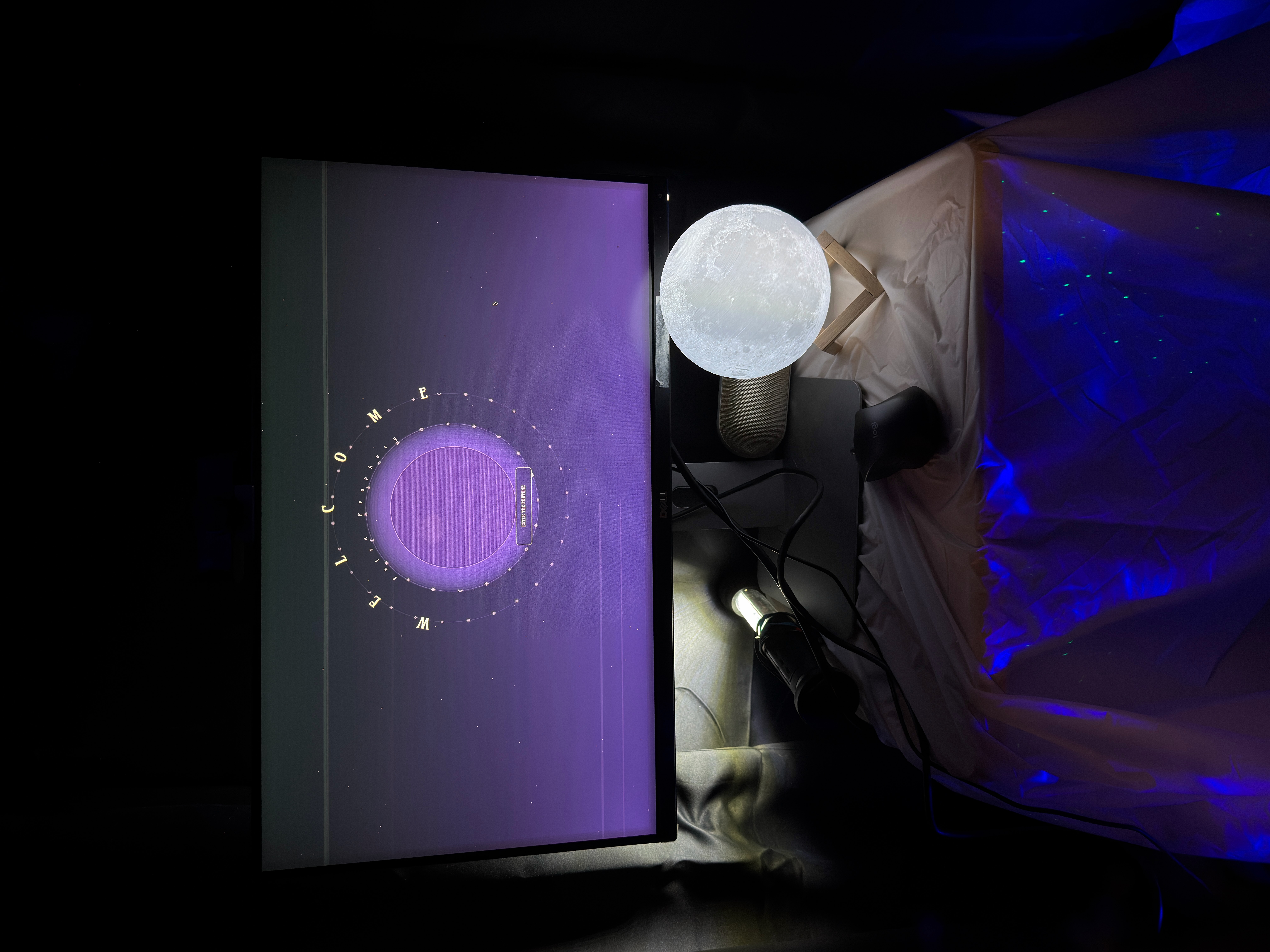 Noctiluca presents an interactive, multisensory installation that combines biophilic design principles with responsive technologies to create a calming, immersive environment. The work features jellyfish-inspired light sculptures that integrate fibre-optic illumination, proximity sensing, and audio-reactive behaviour to support sensory comfort and emotional grounding. When a viewer approaches, each sculpture transitions from a resting state to an active lighting mode and further responds to environmental sound with gentle or dynamic pulses. Surrounding projections and ambient audio extend the underwater aesthetic across the space, reinforcing the installation’s nature-inspired atmosphere.